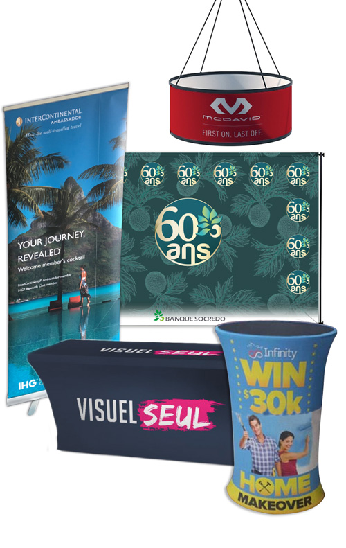 - Foires et expositions : Suspendez des banderoles au-dessus des stands ou des allées pour attirer les visiteurs. Utiliser des jupes de tables pour une meilleure visibilité.